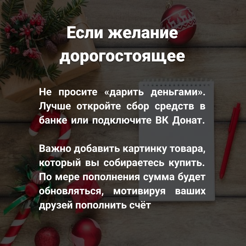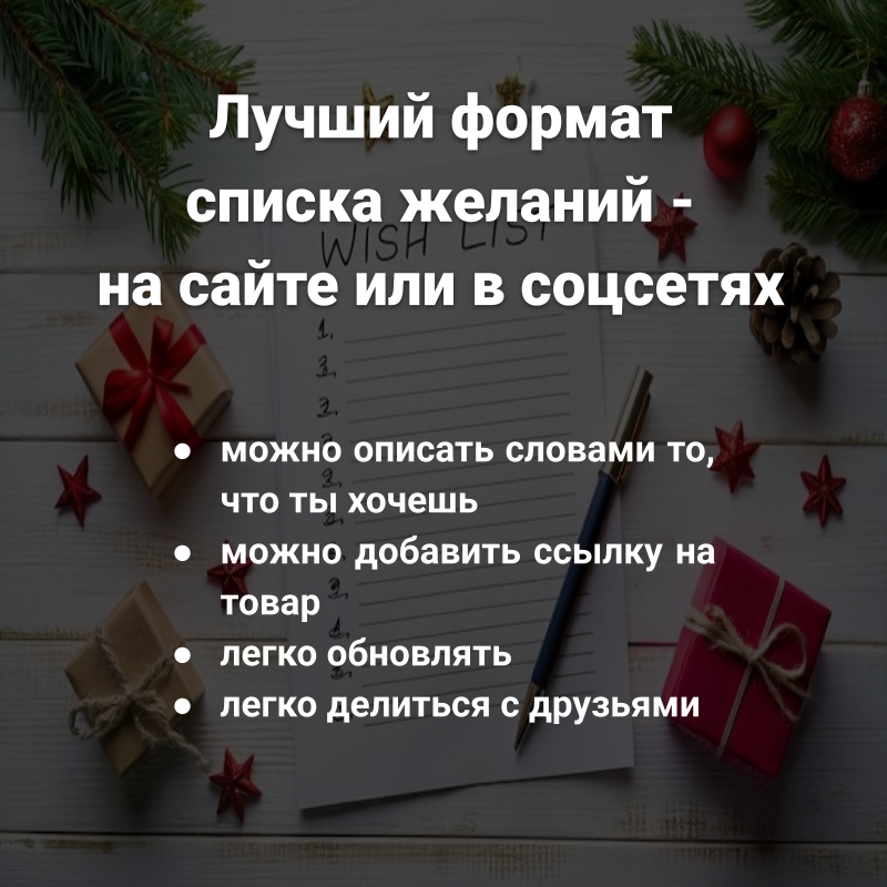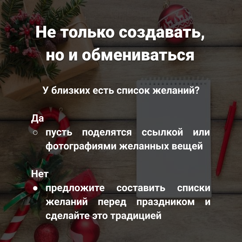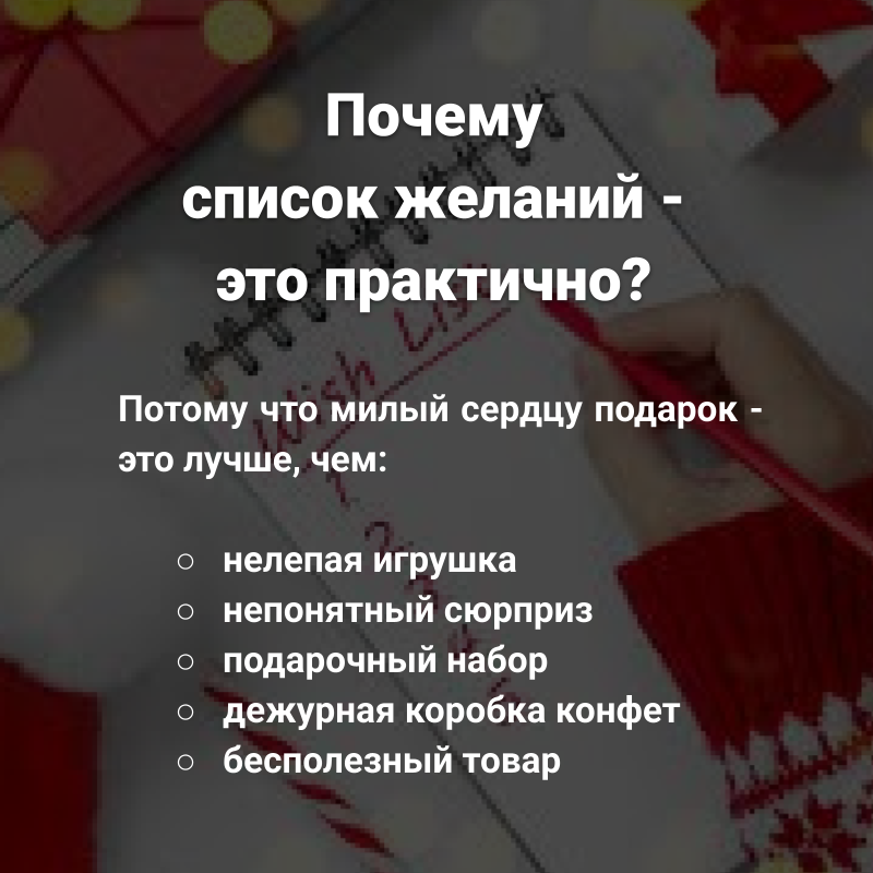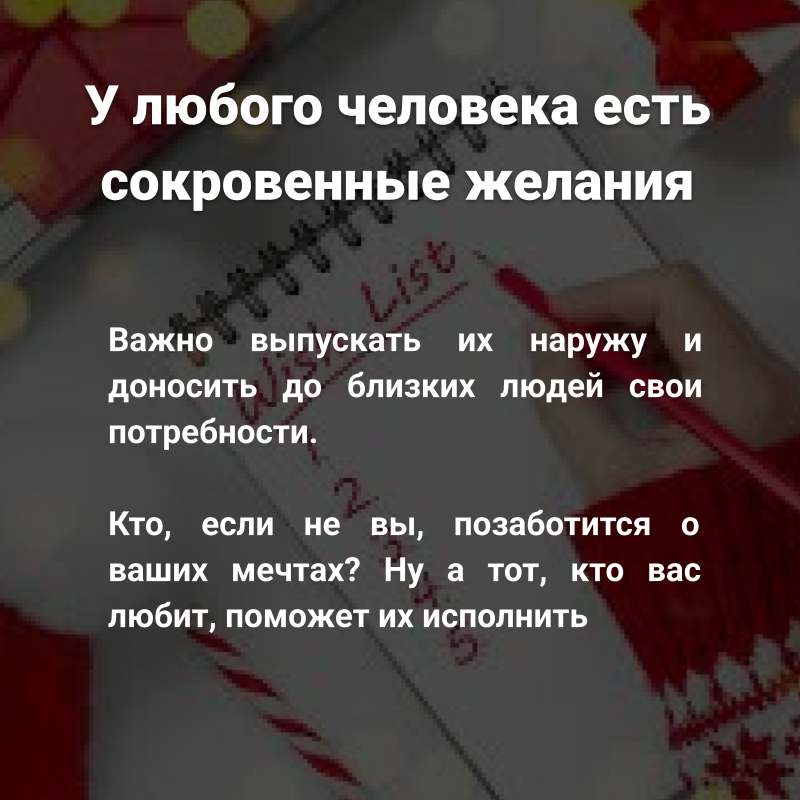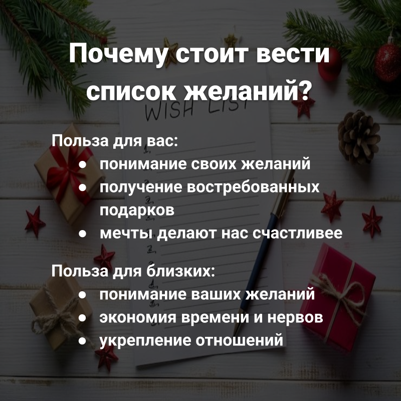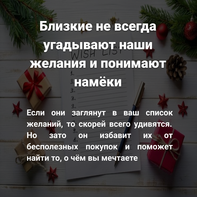 Пожалуйста, дождитесь завершения операцииСписок желаний - это не просто дань моде, а умение множить свои мечты. Загадывая желания, мы думаем о будущем и о тех вещах, которые наполнят нашу жизнь весельем и счастьем ✨❄️❤️ Кроме того, список желаний - это хороший вид коммуникации с людьми, которые нас любят и хотят чем-то порадовать. Не знаете, как составить список желаний? Это просто! Листайте галерею: